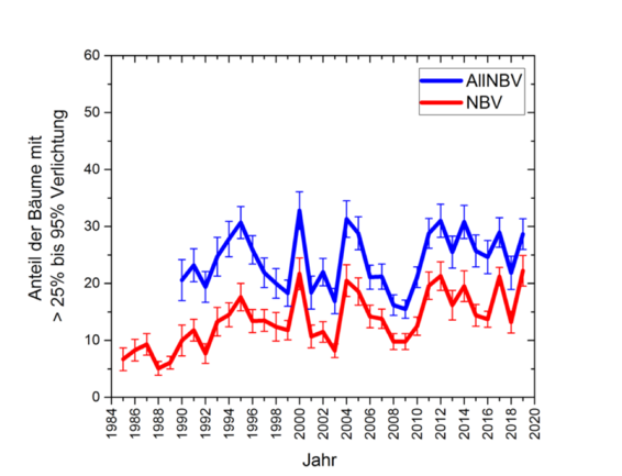 Veränderungen des Gesundheitszustandes und der Mortalität des Bestandes werden mit einer standardisierten jährlichen Kronenbeurteilung (22) der Bäume erhoben, die sowohl auf den LWF-Flächen wie auch auf dem repräsentativen Netz der Sanasilva-Flächen (16x16 km) durchgeführt wird.