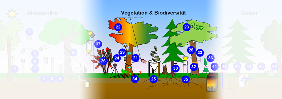 Die Artenzusammensetzung und Bodenbedeckung der Bodenvegetation (34), insbesondere in der Strauch- und Krautschicht, werden auf permanenten Beobachtungsflächen untersucht. Weitere Hinweise zur Biodiversität liefern die Erhebung von Flechten sowie die in Insektenfallen (35) gesammeltem Individuen.