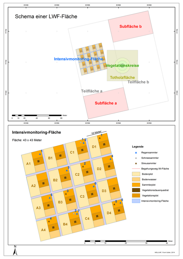 Jede LWF-Fläche besteht aus zwei 1 ha grossen Teilflächen A und B, in denen verschiedene Untersuchungsflächen ausgeschieden werden: