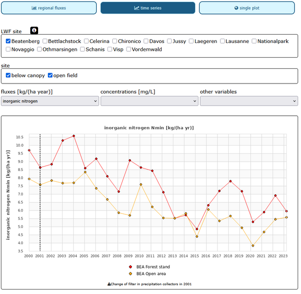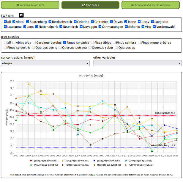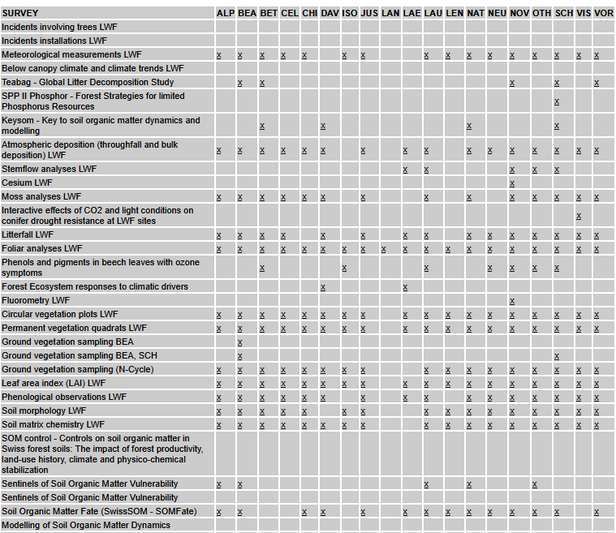 The LWF data consist of short- and long-term research study data with accompanying documentation (metadata). The long-term data series go back to the year 1994 (LWF) and 1985 (Sanasilva-Inventory) respectively. The LWF program annually generates around 25 million data values.