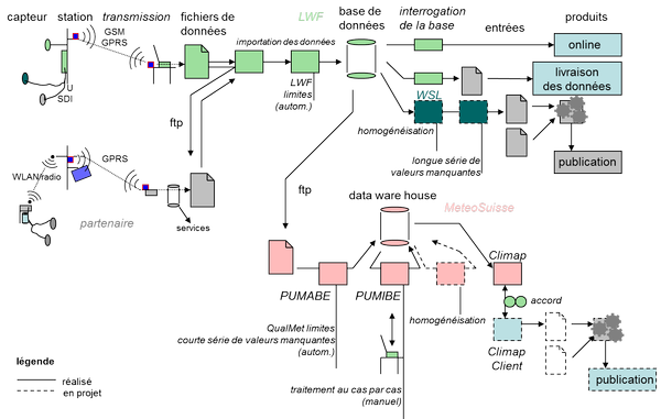 Avec 25 millions de valeurs enregistrées chaque année, une infrastructure automatisée permettant la transmission de données du terrain à une banque centrale de données est indispensable à un programme tel que le LWF. La gestion de données du LWF inclut la sauvegarde des données brutes, les premiers contrôles de qualité et les outils en ligne permettant une surveillance continue des capteurs en place sur le terrain.